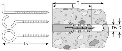 Дюбели «ЕВРО» с различными видами крюков применяются для крепления в полнотелые основания (бетон, кирпич, природный камень) светильников, держателей для полотенец, стенных шкафов, карнизов для штор, сантехнических систем и прочих конструкций. Шуруп с крюком, кольцом или полукольцом вкручивается в дюбель от руки или при помощи биты для крюков.