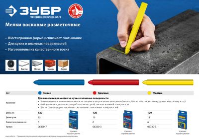 Мелки разметочные восковые ЗУБР предназначены для нанесения разметочных линий и подписей на различных металлических заготовках, трубах и прочих конструкциях при проведении монтажных и строительных работ.