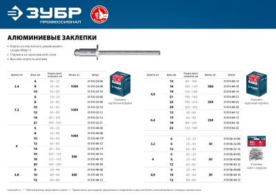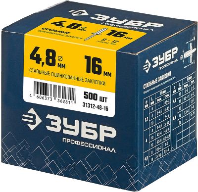 Стальные заклепки, 4.8 х 16 мм, 500 шт, ЗУБР Профессионал 31312-48-16